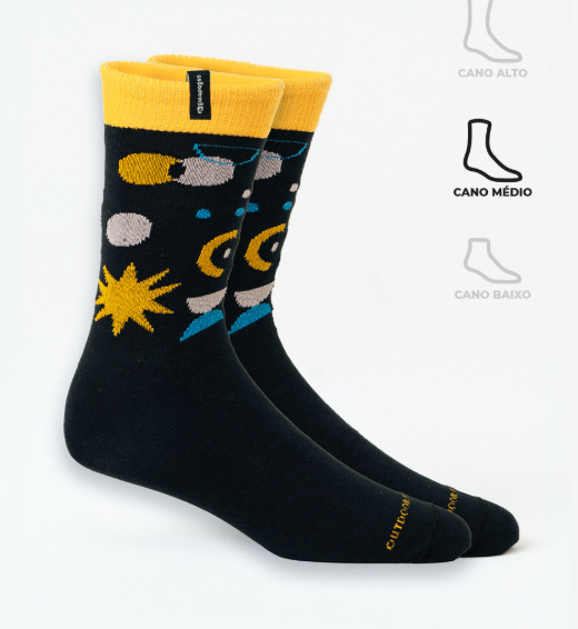 Meia Casual Token GALAPAGOS: Cano Médio, Algodão e Design Geométrico Preto/Amarelo